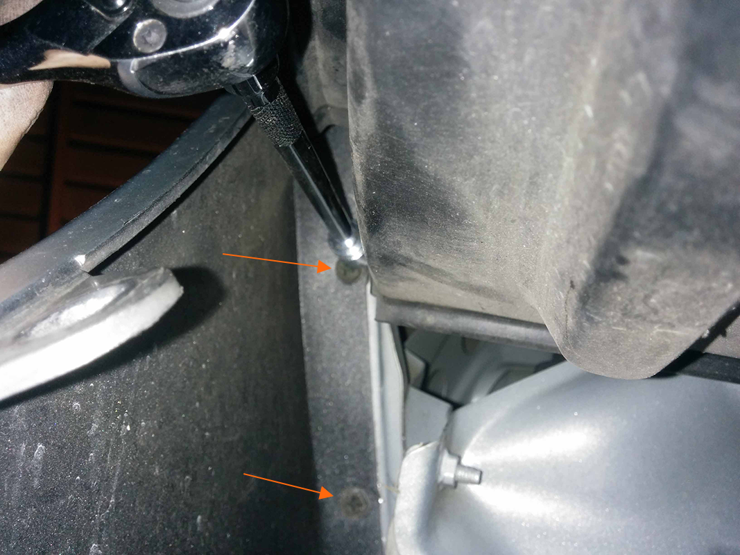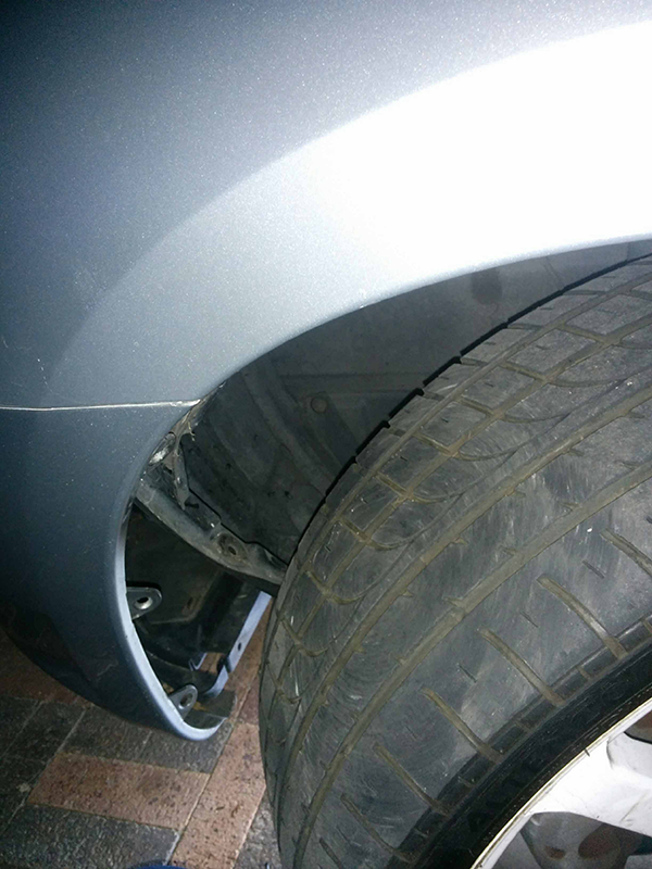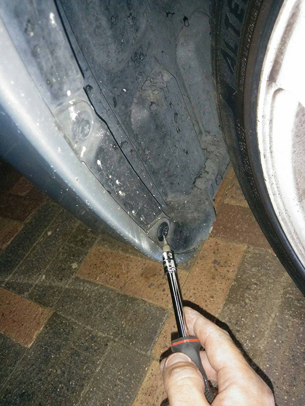Realise that the whole splash guard thing is connected all the way around the wheel well, swear once more and just bend the thing back as pictured, so you can get your ugly mit through the backside of the front bumber.