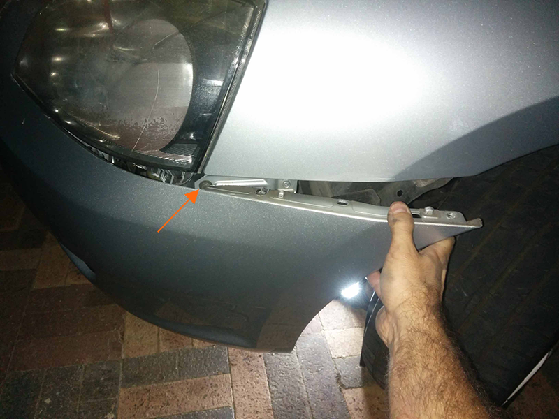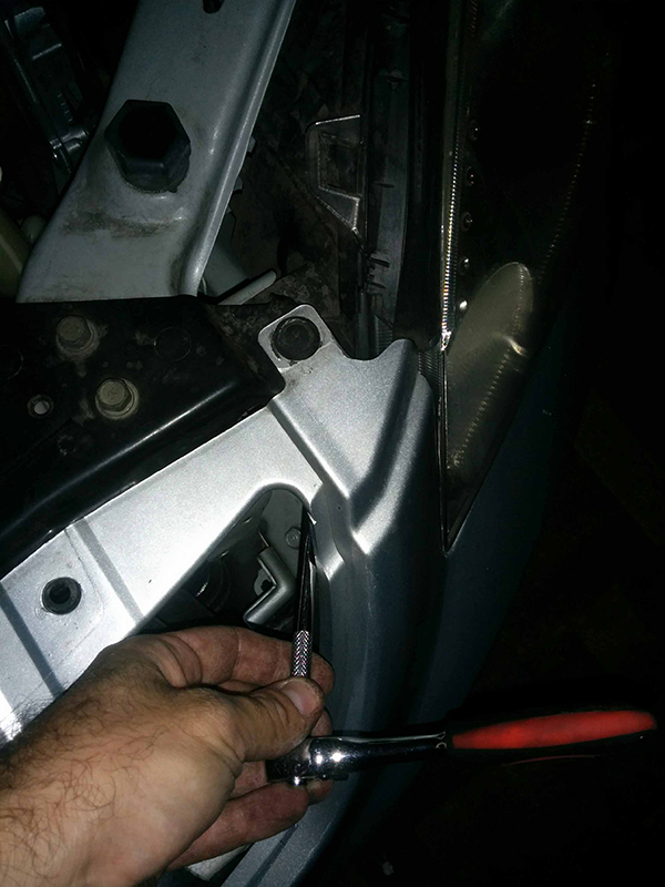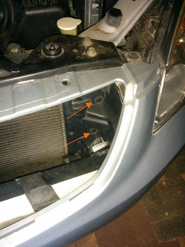 Remove the front bar grill by popping off and destroying each plastic clip thing holding the grill on. The bottom part of the grill is held in by mechanical clips, which you can just simply hold the bottom of the grill, and pull. Then once removed, you will see another plastic guard thing with two more clips. These are a lot easier to remove. Then slide this plastic guard away to reveal the other hidden bolt.