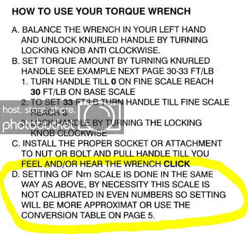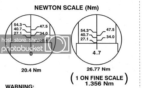 The example given in Nm is actually correct. The coarse Nm calibration below the rotating scale is 20.4, with the rotating scale showing 4.7. Multiplying 4.7 x 1.356 to convert the scale, and adding to the coarse scale's 20.4, gives 26.7732. It may be correct, but it's a total waste of bloody time including the Nm scale on the shaft because who the hell can work that crap out in the garage?? I know my toolbox doesn't include a calculator.